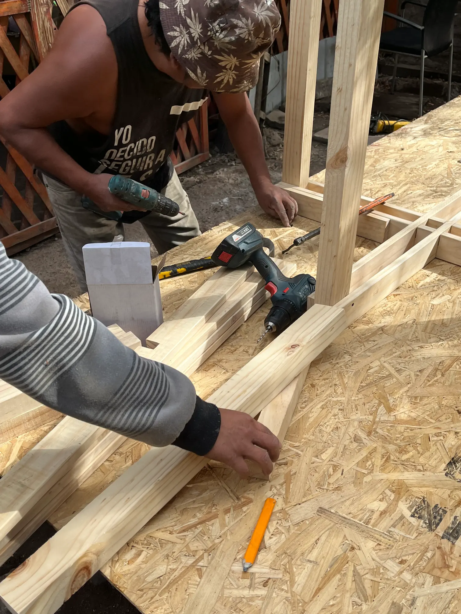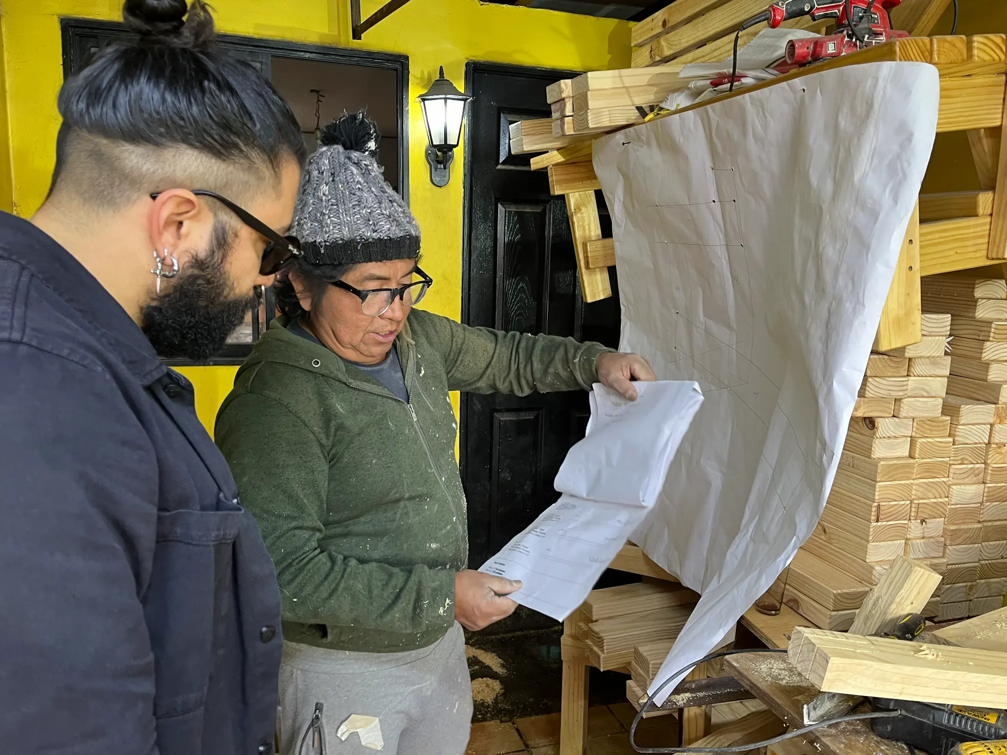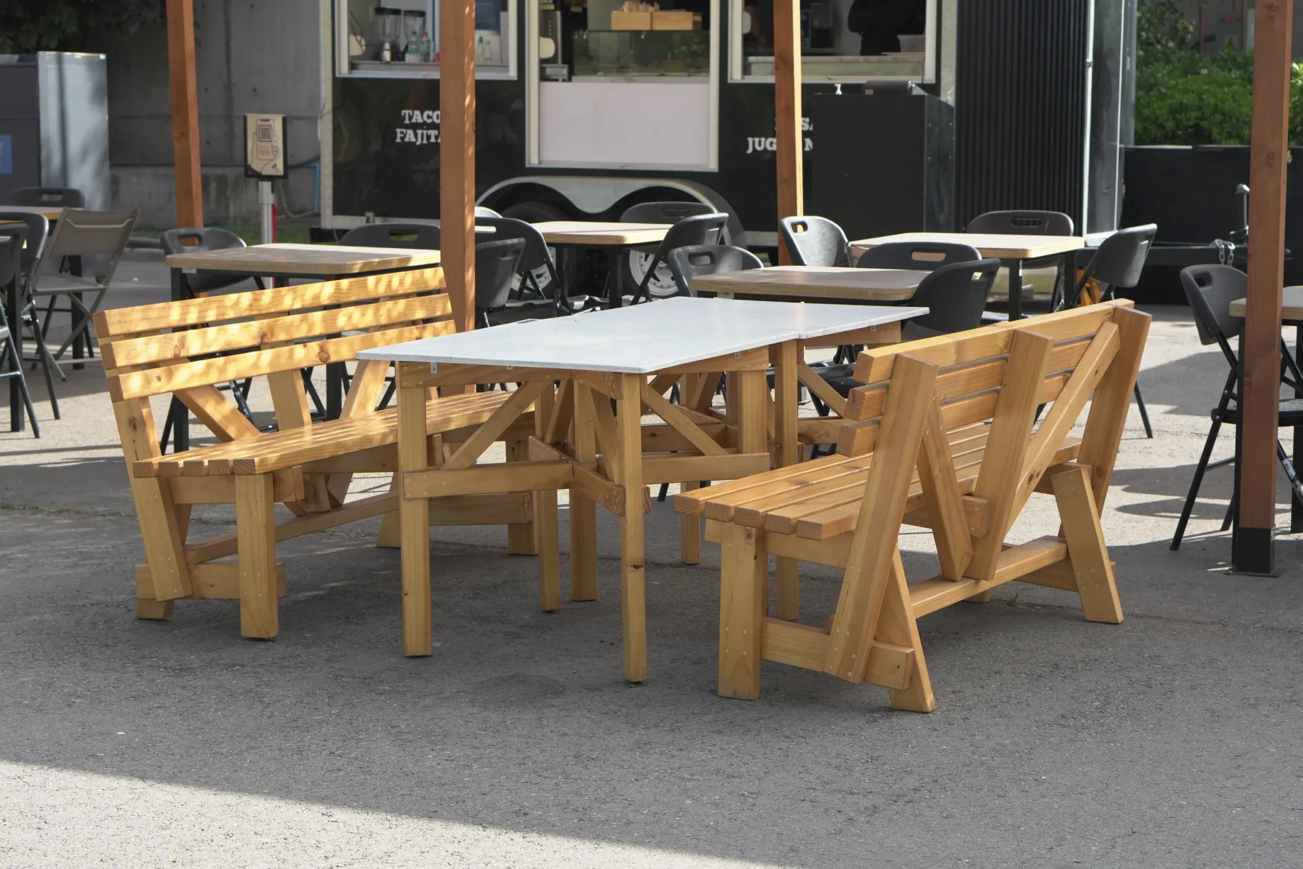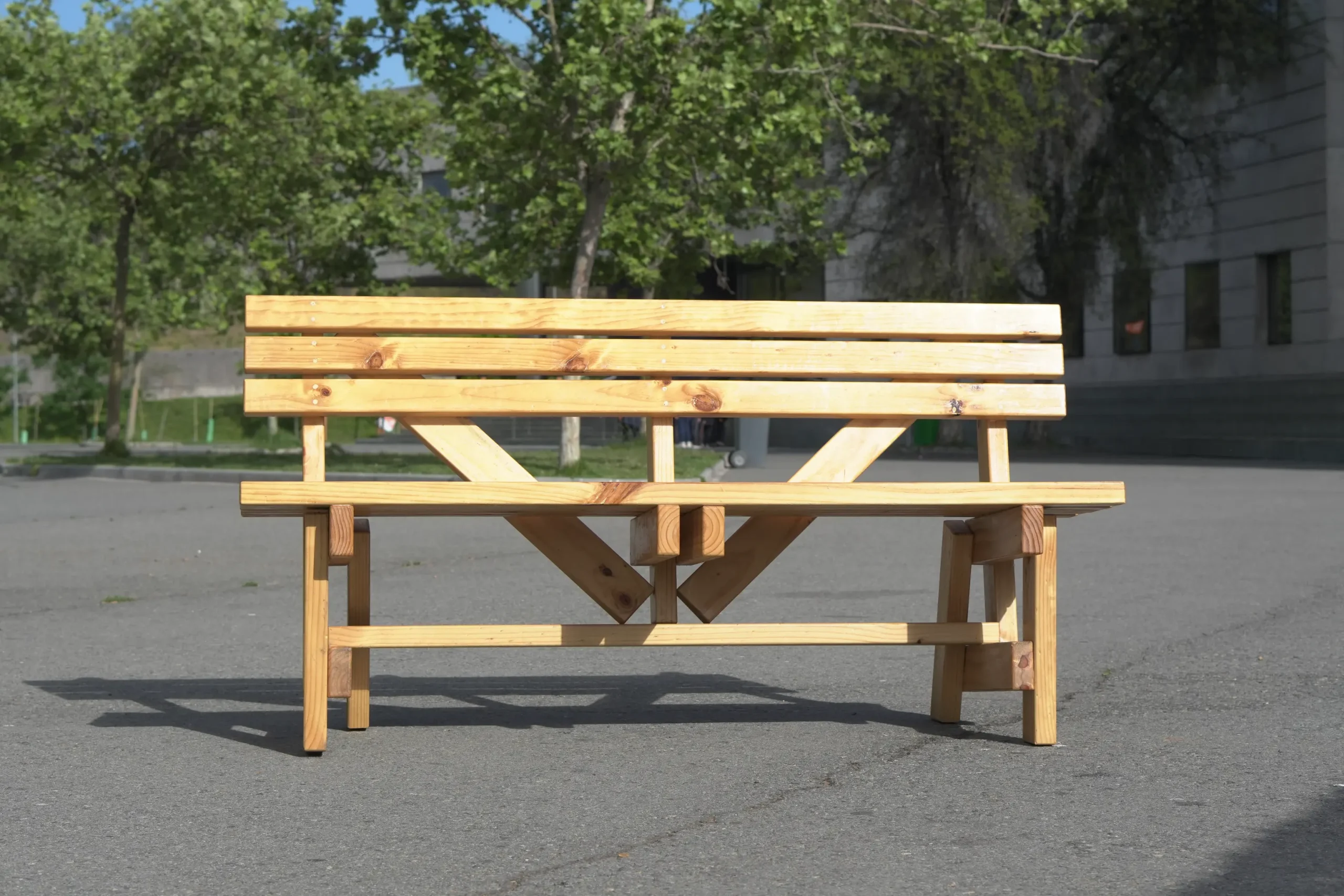 Inspirados en los diseños del diseñador italiano Enzo Mari y su libro Manual de autoconstrucción (2012), el oficio de la carpintería se puso en práctica para lograr un mobiliario resistente para espacios de exterior y de uso cotidiano por las y los visitantes del mim.